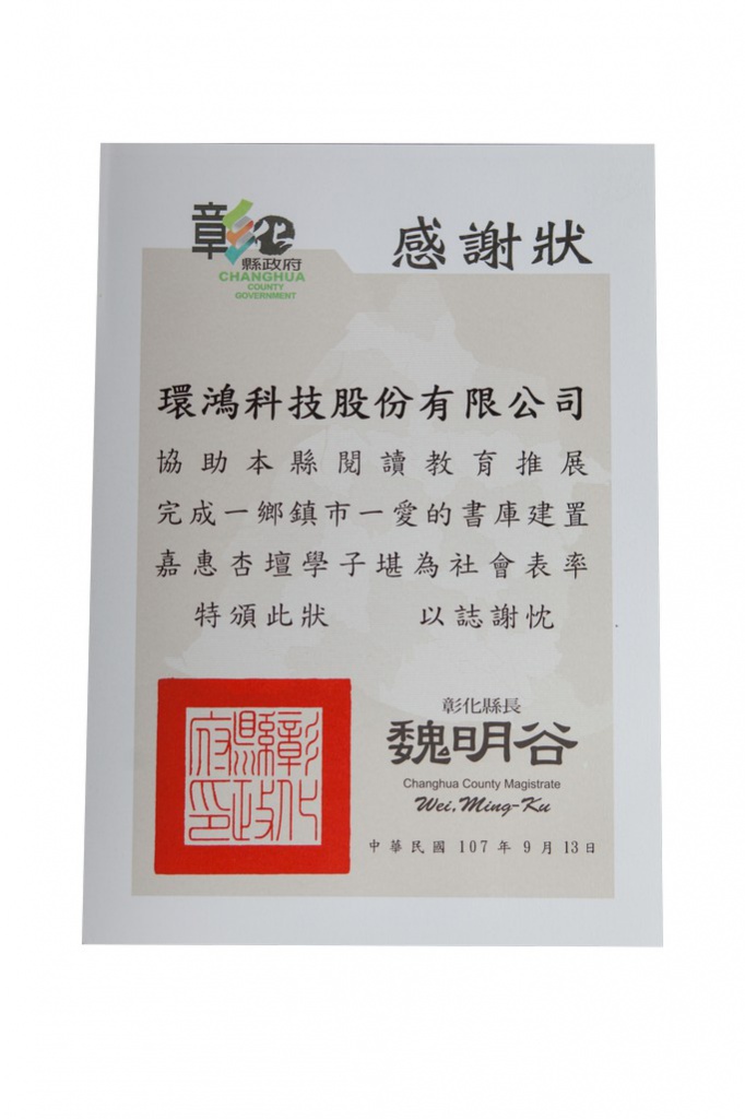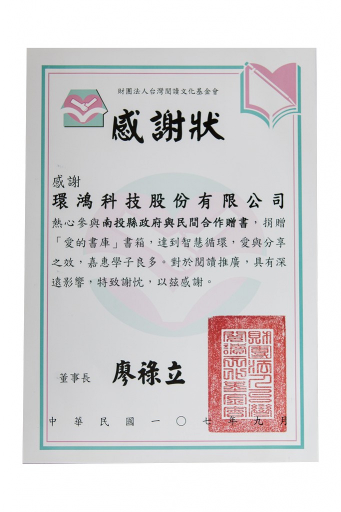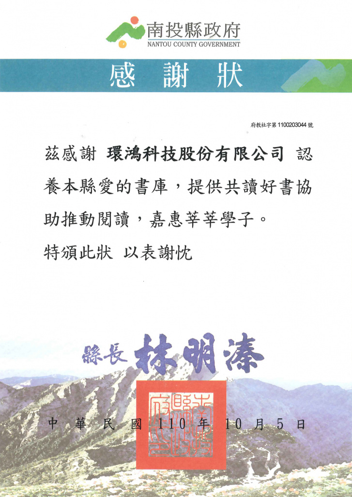 2021南投縣政府感謝狀–愛的書庫 (臺灣廠)