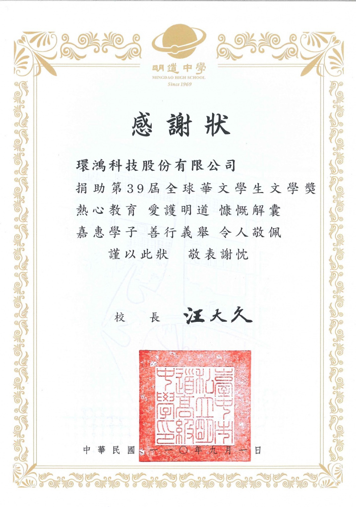 明道中学感谢状–第40届全球华文学生文学奖 (台湾厂)