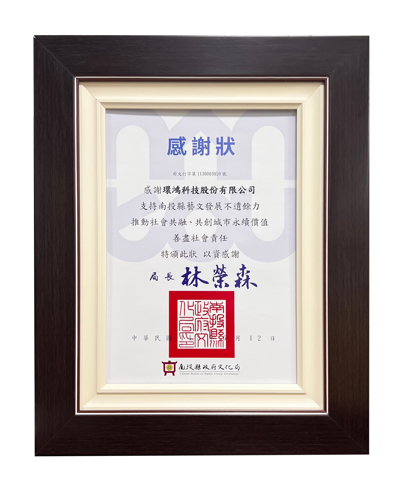 2024南投县政府文化局感谢状 (台湾厂)